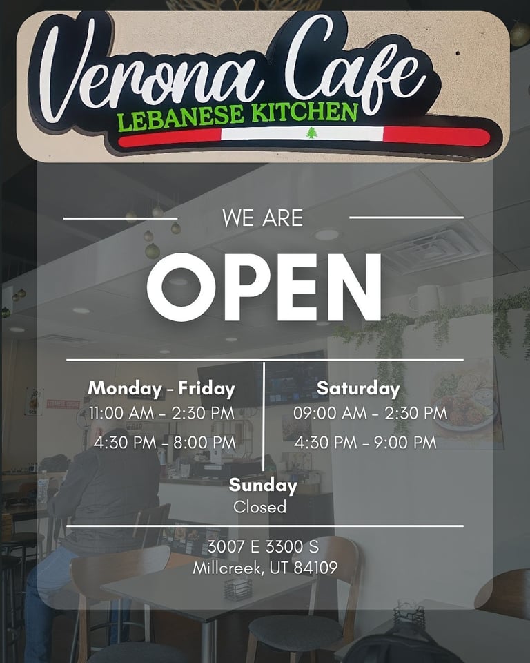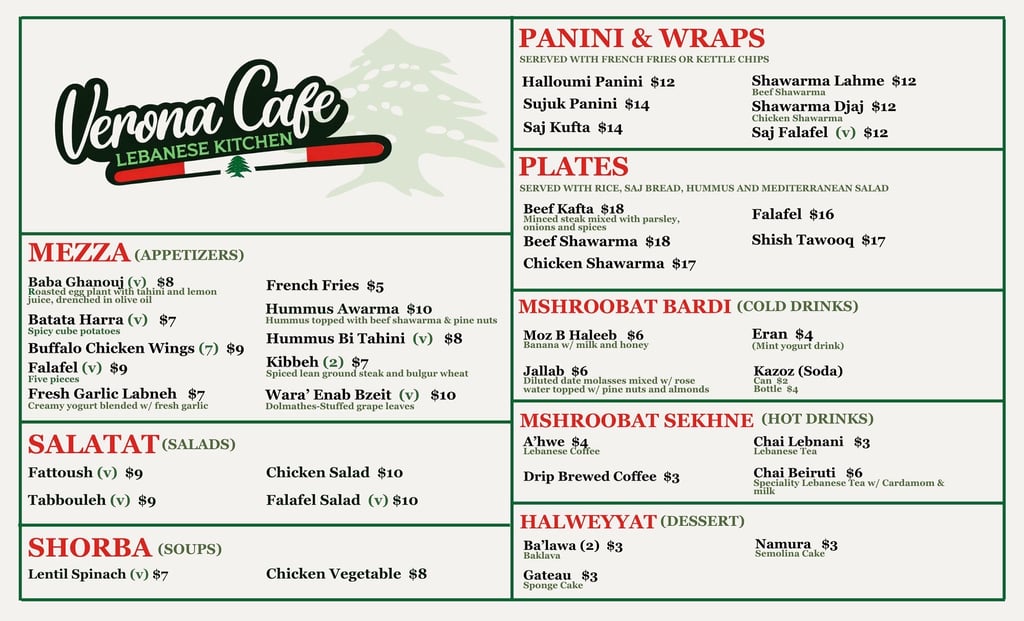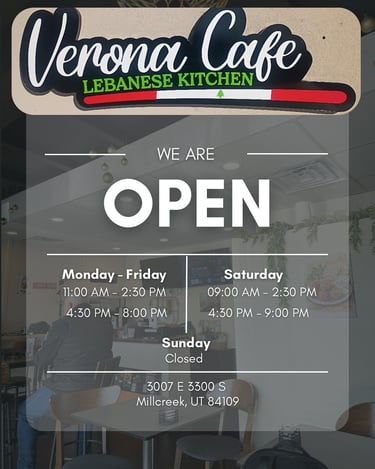 Welcome to our realm of casual dining splendor at Verona Cafe, where Lebanese traditions unfold with Chef Lina’s touch and flair. We invite you to embark on a culinary journey, where each offering is a meticulously crafted tribute to the art of casual Lebanese hospitality. We have strived for perfection, and now we are honored to share with you the finest flavors that pay tribute to the renowned culinary traditions of Lebanon. Come on in and immerse yourself in our uniquely crafted and unforgettable casual dining experience. We promise that every bite is a celebration of gastronomic excellence.